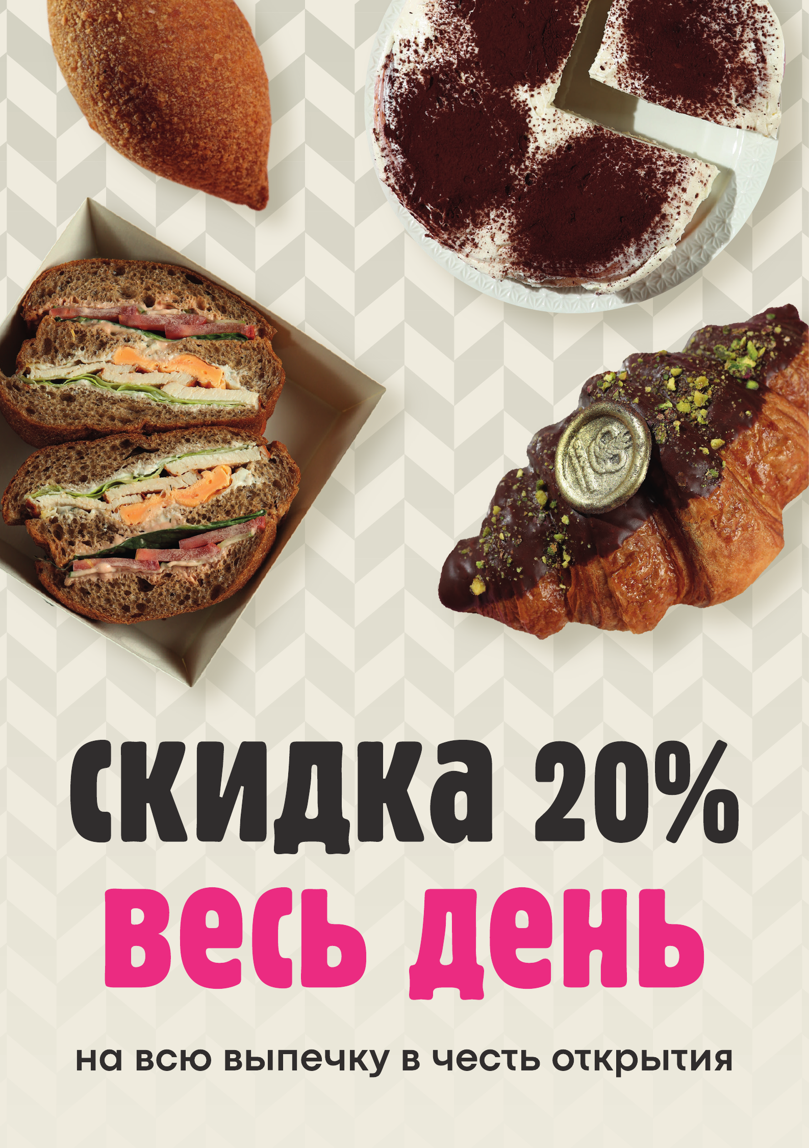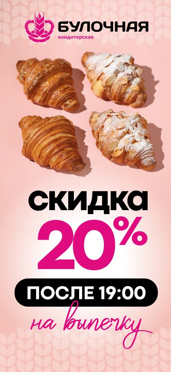 В честь открытия новой Булочной в РК «Спутник» дарим скидку 20% на всю выпечку!